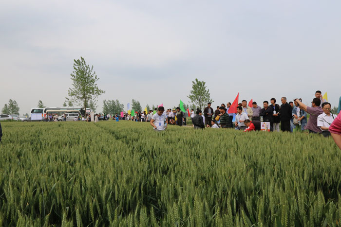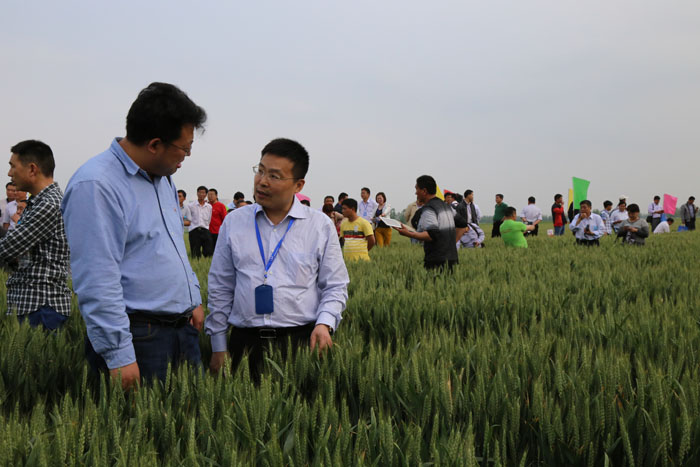 有细心的参观者发现有个别麦株基部叶鞘发黄,像是纹枯病,剥开叶鞘一看,里面茎秆青绿、毫无损伤。安徽省涡阳县一名种田大户告诉记者,他有100亩地,主要种的是百农207,试种了一些淮麦33,从目前长势长相看,两者差不多,但是淮麦33的株型结构好,茎秆第一节间短、粗、壁厚、弹性好,因此抗倒性非常强。“今年这个品种我至少能卖掉5万斤种子。”