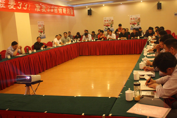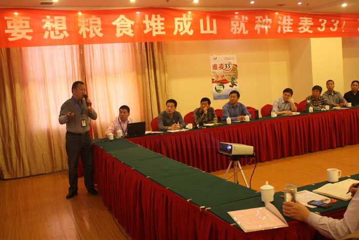 会上公司副总经理胡玉成致欢迎辞,欢迎各位种业同仁的到来,淮安农科院顾正中老师对淮麦品种特性、提纯复壮作了介绍,常规稻麦事业部片区销售经理韩朝建对公司淮麦33营销方案和市场管控作了详细的汇报,各位区域经销商踊跃发言讨论淮麦33宣传营销策略。此次会议,公司还与江苏天丰种业达成共识,统一使用明天种业的包装销售,确保市场稳定。公司副总经理杨地龙最后作总结,感谢大家对淮麦33的关注和支持,表示淮麦33具备大品种的潜质,希望各位经销商携手共进,共驻淮麦33美好的明天。