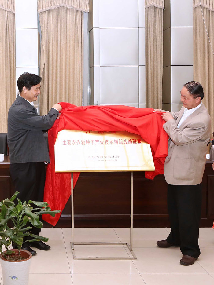 (江苏省农业科学院院长、江苏明天种业科技有限公司董事长严少华,省科技厅副厅长周贡生共同为种业联盟揭牌)