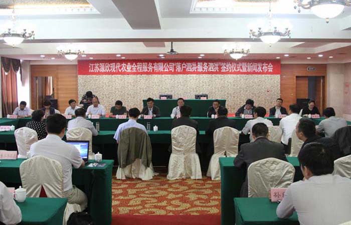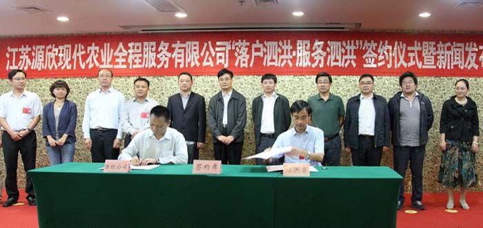 根据此次签订的合作协议,江苏源欣公司将承担该县农业生产全程社会化服务的基本职能,计划在2-3年完成农业生产全程社会化服务项目及体系建设。其中,完成1000亩核心试验示范基地建设,购置先进农业机械和运输工具,建设规模化育秧工厂,建成与服务功能相配套的设备和设施,包括生产资料、仓库、冷库、烘干线、粮食加工等。届时将为泗洪县种田大户、家庭农场、农业合作组织和农业产业化龙头企业等提供优良品种(种子、种苗)服务,提供耕翻、播种(栽插)、收割、秸杆处理利用等全程机械化服务,提供施肥、植保等专业化服务,提供稻麦仓储、烘干及初加工服务,提供生产过程中的融资服务,提供技术培训、技术交易等相关服务。