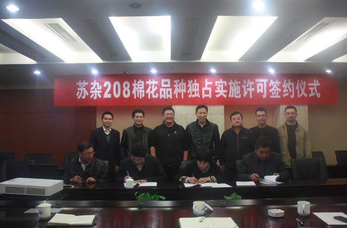 11月13日下午,棉花新品种“苏杂208”独占实施许可权转让签约仪式在院三楼会议室举行。省农科院知识产权处副处长张初贤、经作所所长倪万潮、副所长张洁夫 、品种育成人肖松华、公司党支部书记、常务副总经理刁阳隆、公司副总经理王宁等出席了签约仪式。