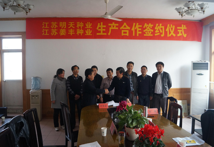 此次与江苏姜丰种业的小麦生产基地合作项目是2013年在姜堰区科技镇长团牵头下,明确双方合作在新品种、新技术展示、生产、推广方面的最新成果体现。根据协议约定,江苏明天种业利用股东单位江苏省农科院研发的高产小麦品种,依托江苏姜丰种业的土地资源与加工设施平台,生产繁育优质良种。江苏姜丰种业生产的小麦种子,经江苏明天种业验收合格后除保障本地区供应外,还将辐射至扬州、泰州、南通等地供农民用种,本次项目合作金额达800万元。