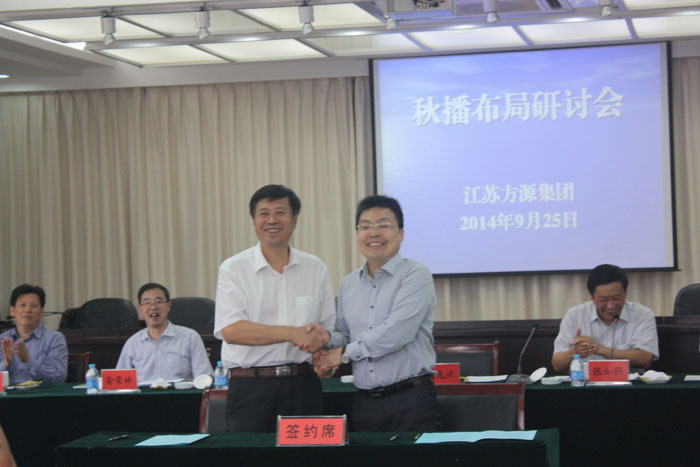 会议期间,我公司总经理严辉民同方源集团总经理倪龙兴共同签署了《战略合作协议书》,并分别同江苏江淮种子公司(大中农场种子公司)、五图河农场种子公司、洪泽湖农场种子公司就我公司“宁麦13”和“淮麦33”两个小麦大品种签订了《2014年秋播小麦预约繁种合同》,另外徐州国家粮食储备库就我公司优质强筋小麦新品种“徐麦32”同洪泽湖农场和五图河农场拟定了《“徐麦32”商品粮生产合作协议》。