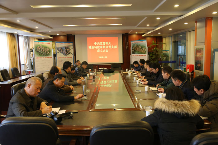 2015年1月28日,中共江苏明天种业科技有限公司支部成立大会在江苏天坤集团公司会议室召开,会议宣读了中共丹阳开发区工委、江苏天坤集团党委《关于中共江苏明天种业科技有限公司党支部批准成立的批复》,江苏天坤集团总裁张立民、副总裁马海强、丹阳开发区工委组织人事局吴志江副局长、公司党支部11名党员,1名入党积极分子共同出席了此次会议。会议由集团副裁马海强主持。