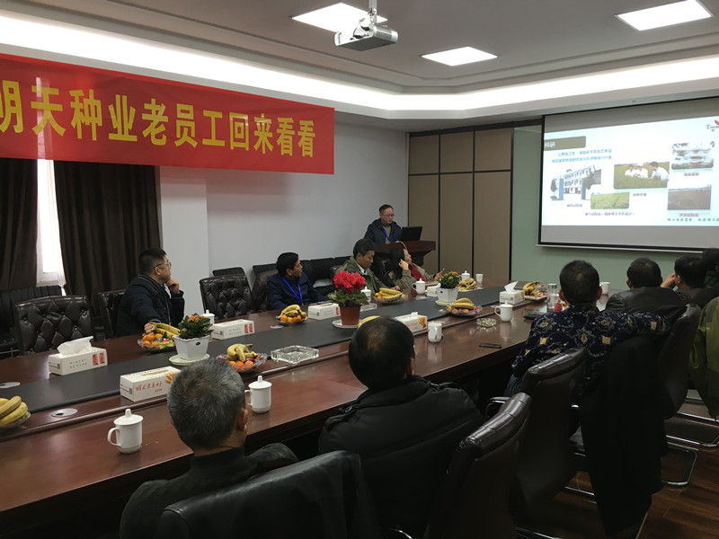 会议由公司杨地龙副总经理主持,首先杨总对各位老员工的到来表示欢迎,然后由杂交水稻部经理杨海波介绍明天种业的发展,向老员工们展现了明天种业十五年来发展壮大的历程,着重介绍了公司最新成绩--成功在新三板挂牌,然后又将公司未来的发展规划蓝图展现在与会的老员工面前。