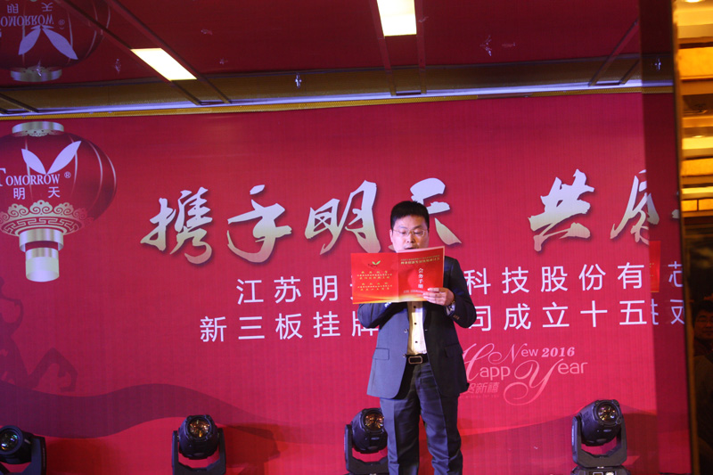 2016年2月2日晚,值此江苏明天种业科技股份有限公司新三板挂牌之际,公司在紫金生态园隆重举行江苏明天种业科技股份有限公司新三板挂牌暨成立十五周年庆典活动。江苏省农科院、南京农业大学、江苏省科技厅、江苏省农委相关领导及公司合作伙伴、老员工代表和全体员工共计350人参加了此次活动。