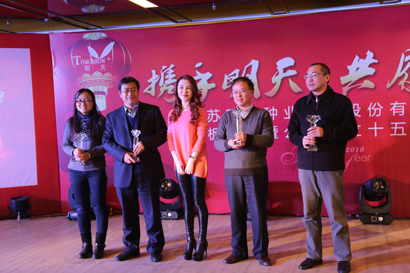 江苏明天种业于2001年由江苏省农科院创办,15年来,明天种业的发展,得益于各级领导的大力支持,得益于公司员工的辛勤努力,得益于新老客户的垂青厚爱!庆典活动上,公司对15年来,一直与我公司携手同行,经历过荆棘与坎坷,也一起分享成绩与荣耀,一直不离不弃的四家单位:罗山明天种业、江苏省联丰种业、江苏姜丰种业、宣城市宣种种业有限责任公司颁发了“守护之星”奖杯,感谢他们对明天种业一如既往的支持;对安徽省寿阳种业、罗山明天种业、宿迁金田种业、阜南县丰悦种业服务中心、宣城市宣种种业、江苏姜丰种业、泗洪县双丰种业有限公司、江苏省联丰种业、海门市兴安种子经营部、亳州市种子公司、新洋农业试验站、高邮珠湖种业、江苏金色农业、南京神州种业、建宁县裕信种子专业合作社等十五家诚实守信、合作共赢的合作伙伴颁发了“明天之星”奖杯;对明天种业十五年来做出杰出贡献的王才林研究员、盛生兰研究员、马鸿翔研究员、顾正中研究员等五位专家颁发了“特别贡献奖”;对金杨、杨地龙、徐江、王波、杨海波等五位工作满十三年以上的老员工颁发了“奉献奖”。