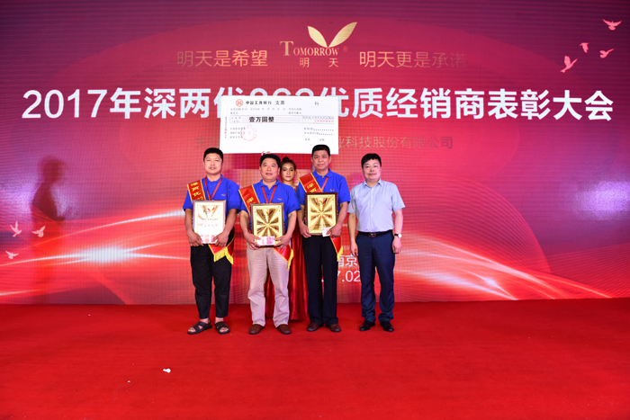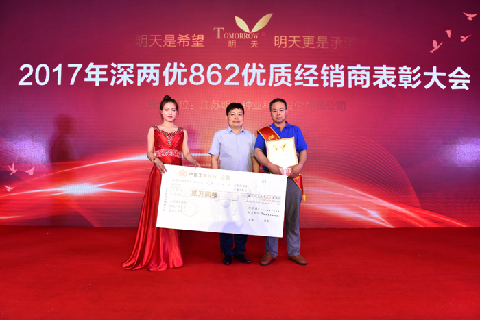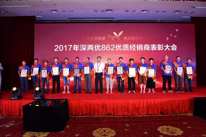 在接下来的颁奖典礼中,首先是对在今年深两优862推广上表现优异的50位乡镇零售商进行颁奖,以表彰他们今年在深两优862推广、销售上付出的努力,鼓励他们在下一年的销售中更上一层楼,其中零售商代表安徽天长李先家、江苏睢宁韩兵华分享了深两优862在当地的田间表现、创新的推广模式等,充分阐述了深两优862“多穗矮秆、易种好管”的品种特点,精彩之处赢得了台下一阵阵热烈的掌声。伴随着一段赏心悦目的表演过后,颁发的是江苏明天种业最高荣誉奖项--“明天之星”,获奖的6位县级经销商在激昂的音乐中依次登上领奖台,全场爆发出雷鸣般的掌声,随后由县级经销商代表安徽寿县鲍广文、江苏盱眙乔泽华分别就深两优862推广心得、在田间的强势表现以及与江苏明天种业合作过程等作了分享,强调深两优862“稳产、高产、抗逆性强”的特点已经深入人心,并盛赞与江苏明天种业的合作更是“安心、放心、舒心”。伴随着美妙的旋律,本次会议圆满落幕,正如歌声中所唱“让我们期待着明天会更好”。