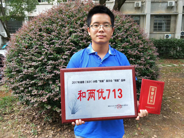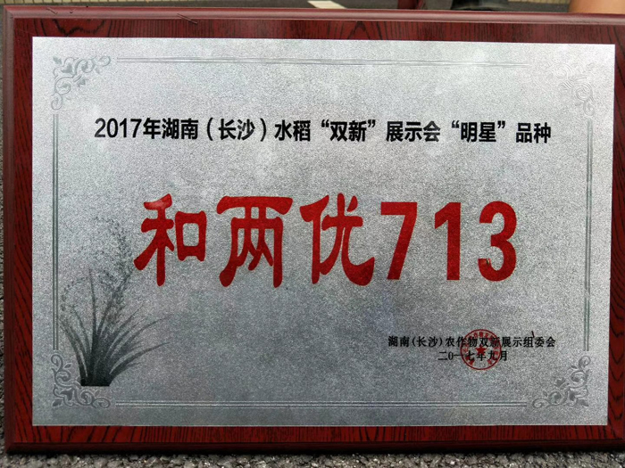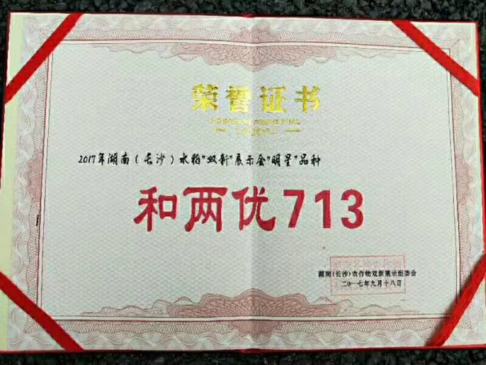 和两优713凭借其株型紧凑,剑叶上挺,亩有效穗高达24万穗,杆青籽黄等一系列突出的田间表现,脱颖而出,成功当选2017年湖南水稻双新展示会“明星”品种,并获得由湖南农作物双新展示组委会颁发的荣誉证书。